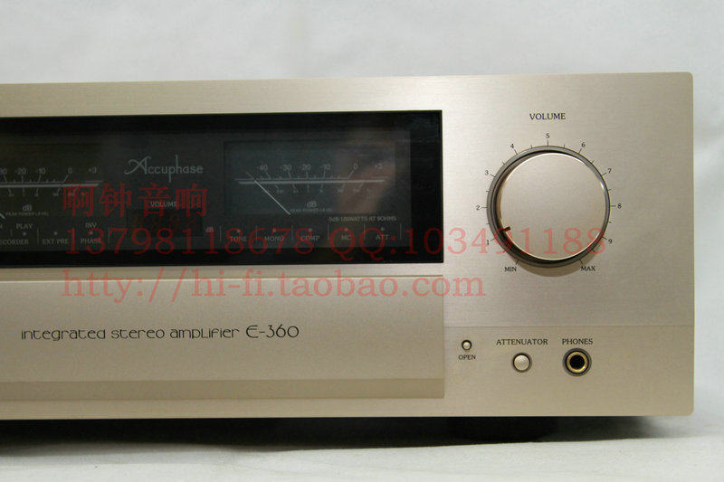 ◆阿钟音响◆ 金嗓子/Accuphase E360 发烧HIFI合并功放 、大昌正品行货 全新展示品 ACCUPHASE日本金嗓子E-360合并功放,根据用户要求改善音质,荣获音响铭机奖银奖采用AV/VA方式的电子模拟式音量最新技术 另外根据反馈,输出外接口接近扬声器端口,阻尼系数从120大幅增加到200,对于扬声器而言推动力加大颇有意义。机身表面,前置面板用数字进行标示并且中间可以调节音量。可改善低频分辨率。 ●额定连续平均输出:140W/ch(4Ω),120W/ch(6Ω),100W/ch(8Ω) ●总谐波失真:0.03%4~16Ω负荷(两频道同时20Hz~20kHz间) ●IM失真率:0.01% ●频率特性:POWERINPUT额定连续平均输出时20Hz~20kHz -0.2dB,1W输出时3Hz~150kHz -3.0dB,HIGH LEVEL INPUT额定连续平均输出时20Hz~20kHz -0.2dB ●倾销系数:120(8Ω50Hz) ●消耗功率:280W ●外形尺寸:465W×171H×422D mm